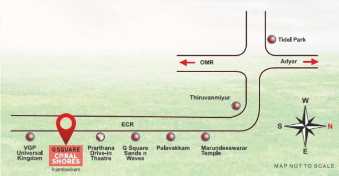 G Square Coral Shores at Injambakkam located bang on ECR Main Road, offers the best of connectivity and entertainment. Being just 10 minutes from Thiruvanmiyur and plenty of amenities and entertainment in close proximity, G Square Coral Shores offers just 5 residential plots and 3 commercial plots. Building your villa or setting up your business, you are sure to enjoy great returns here. Here, there is no lack of entertainment with the beach in walking distance and landmarks like Prarthana Drive-in and VGP Golden Beach close by. The project is complete with all essential features like blacktop roads and street lights. The plots are CMDA approved and RERA registered and come with clear titles.
