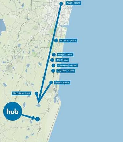 Location Advantages:. Divyasree Hub 6 is strategically located and provides direct connectivity to nearly all other major points in and around Chennai. It is one of the most reputable address of the city with easy access to many famed schools, shopping areas, hospitals, recreational areas, public gardens and several other public amenities.