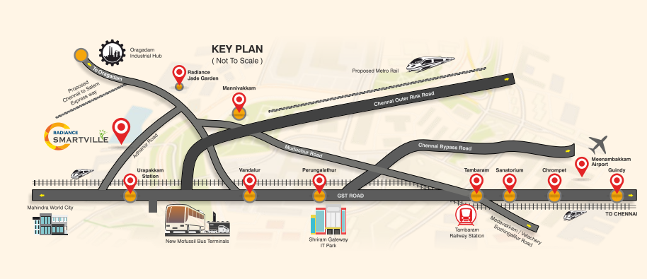 Located at Sriperumbudur, Chennai, Radiance Smartville is inspiring in design, stirring in luxury and enveloped by verdant surroundings. Radiance Smartville goal is to deliver developments that are finely crafted, and where the quality of finish shine through in every development, from inception to completion. Radiance Smartville is an ultimate reflection of the urban chic lifestyle brought to us by Radiance Realty Developers India Ltd. The project hosts in its lap 240 exclusively designed Plots, each being an epitome of elegance and simplicity. Radiance Smartville comprises every modern amenity required for a luxury living namely Avenue Tree Plantation, Badminton Court, Basket Ball Court, Compound, Cricket Court, Gym, Landscaped Garden, Play Area, Rain Water Harvesting, Seating Area and Street Light. Radiance Smartville is in the company of schools, hospitals, shopping destinations, tech parks and every civic amenity required, so that you spend less time on the road and more at home.